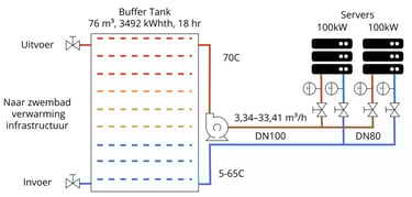We designed an innovative heating system for a swimming pool in the Netherlands, integrating a 200 kW water-cooled server rack to deliver 194 kWth at 70 °C into a 76 m³ buffer tank that feeds the pool’s heating infrastructure. The system, distributed over two server racks, ensures efficient heat transfer. This sustainable solution replaces gas-based heating, saving approximately 356 m³ of natural gas per day and reducing CO₂ emissions by 328 tons per year.